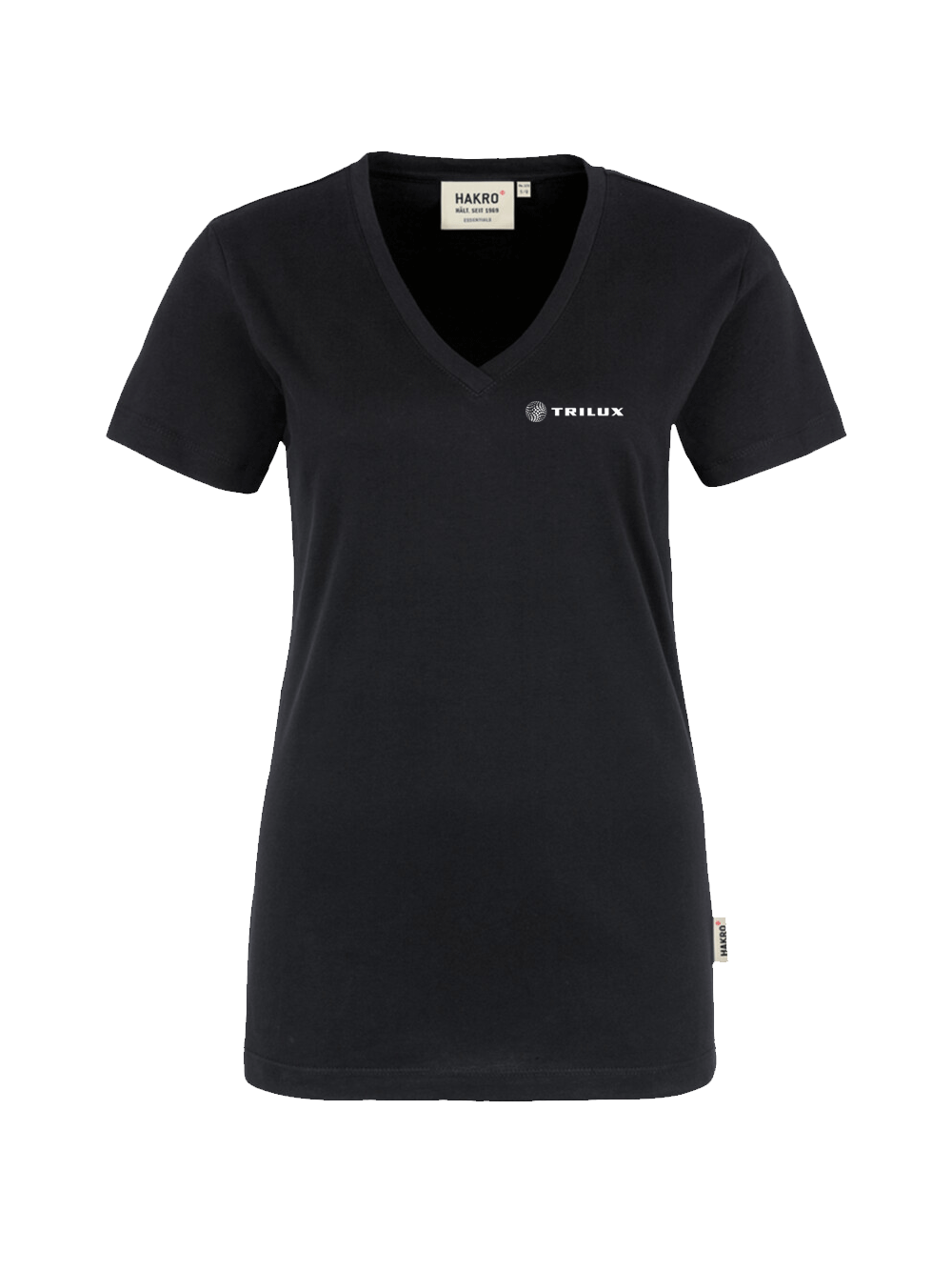 Klassisches T-Shirt für Damen, mit feminin geschnittenem V-Ausschnitt, modisch schmalem Halsbündchen und Nackenband. Hergestellt aus feinem, mittelschwerem Single-Jersey aus langstapeliger, gekämmter und ringgesponnener CmiA-Baumwolle. Gewebtes HAKRO Necklabel aus hochwertigem Kettsatin mit weichen, ultraschallgeschnittenen Bandkanten für höchsten Tragekomfort und gewebtes HAKRO Flaglabel an der linken Seitennaht.