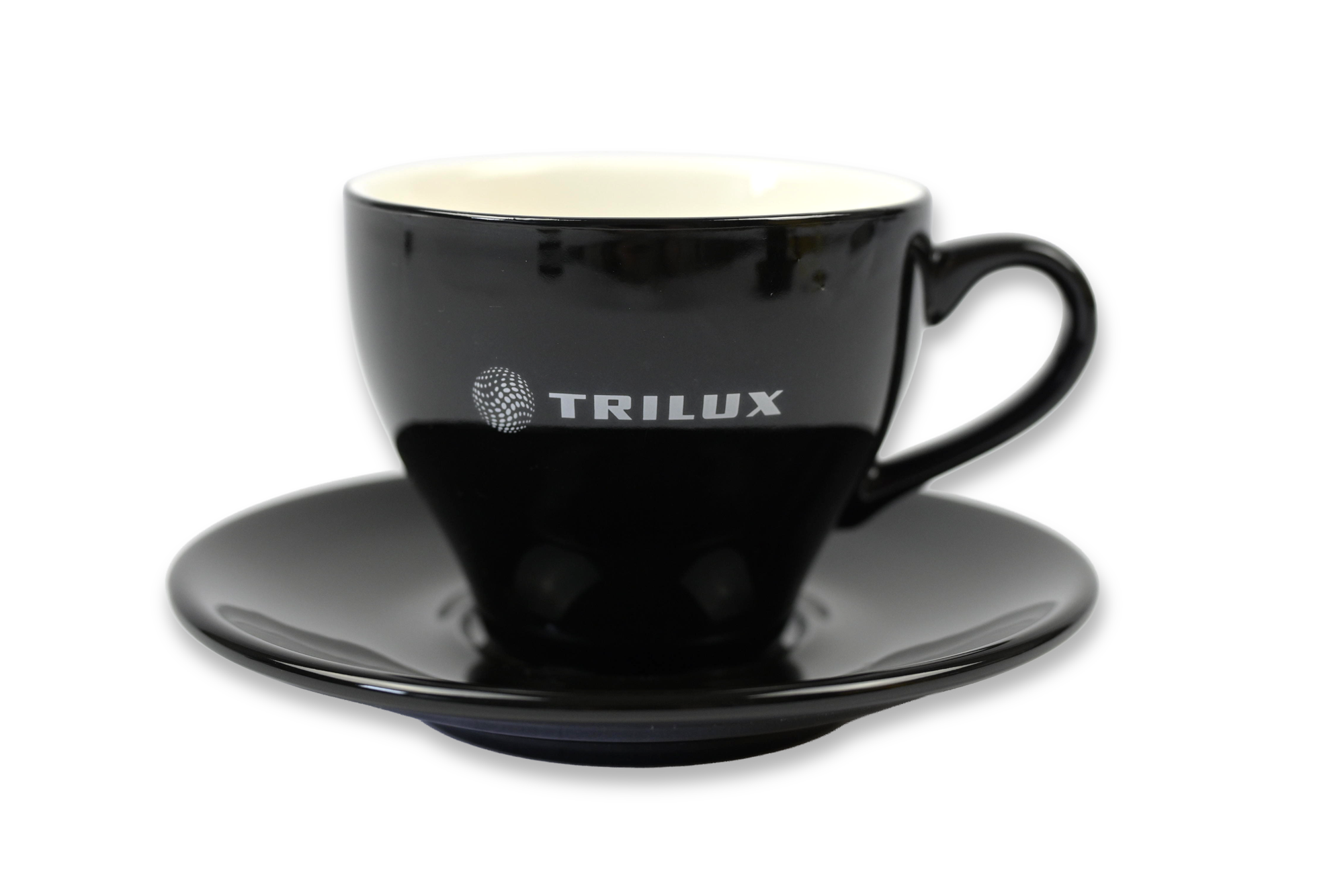 Eine elegante schwarze Tasse mit weißem Innenbereich, Fassungsvermögen ca. 130 ml. Ideal für den täglichen Gebrauch oder als Geschenk.