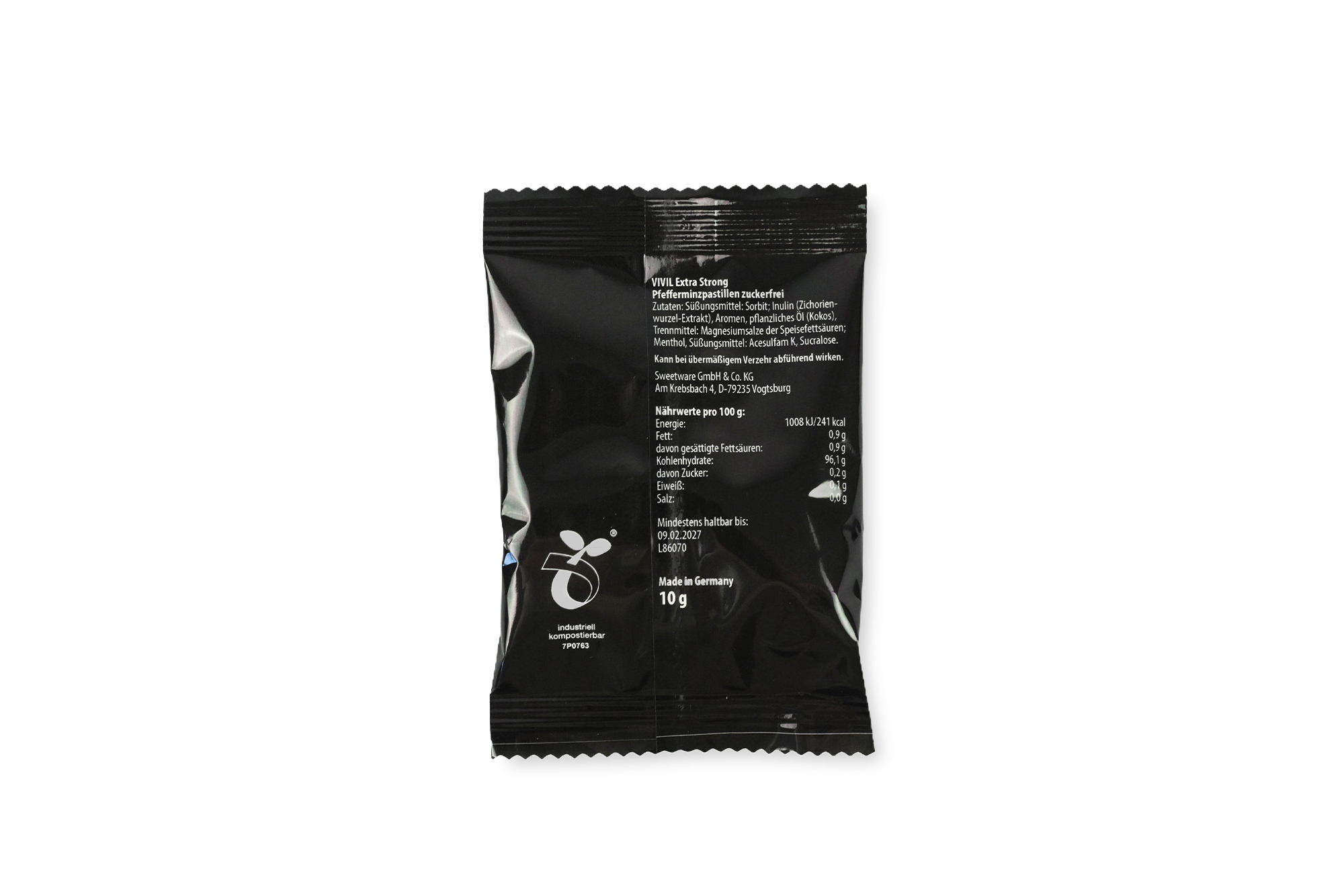 Zuckerfreie Pfefferminzpastillen in 10g Tüten verpackt.